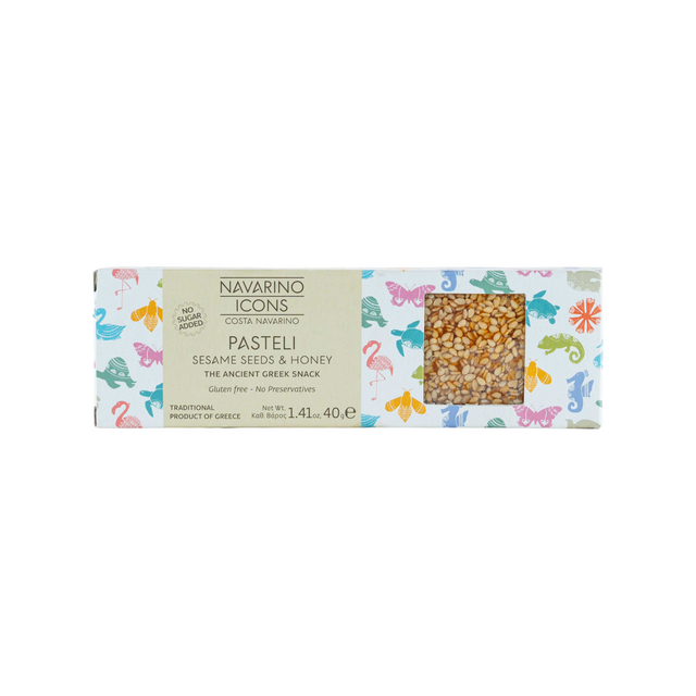 Made with only honey and sesame seeds using a traditional Messinian recipe. Rich in plant-based protein and vitamin E. Gluten-free, made without preservatives, additives, and added sugars.